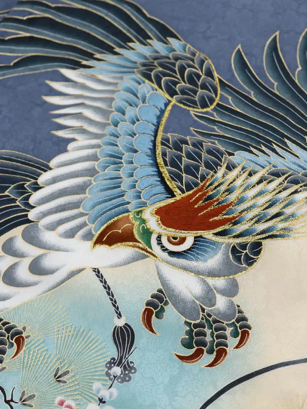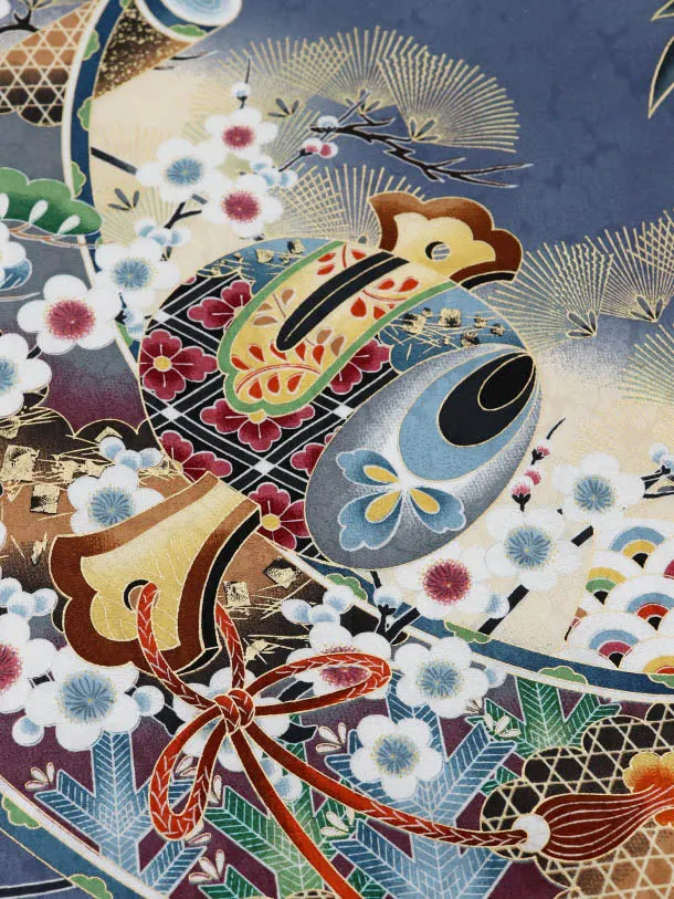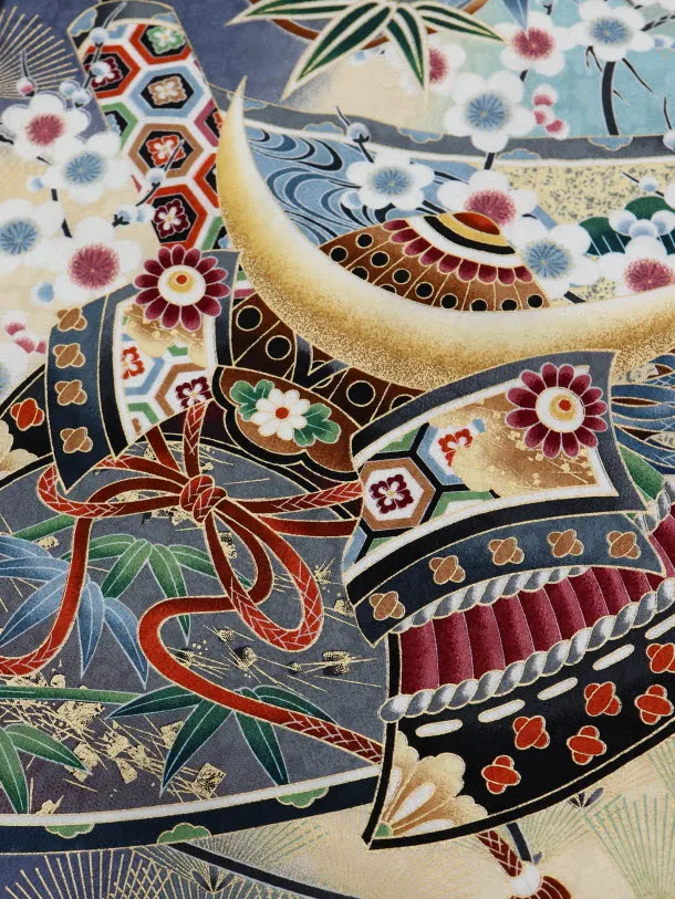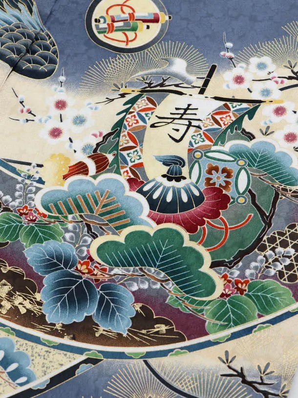 グレー地に、兜と鷹が描かれたお着物です。シックなグレーに鮮やかな色使いで描かれた兜と鷹が豪華で華やかな雰囲気です。お子様の健やかなる成長を願う日にふさわしい一枚です。