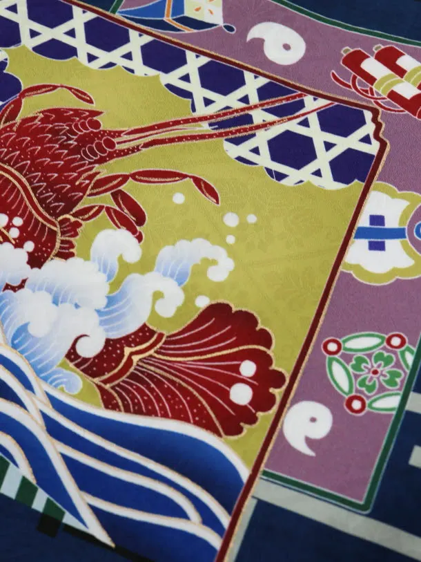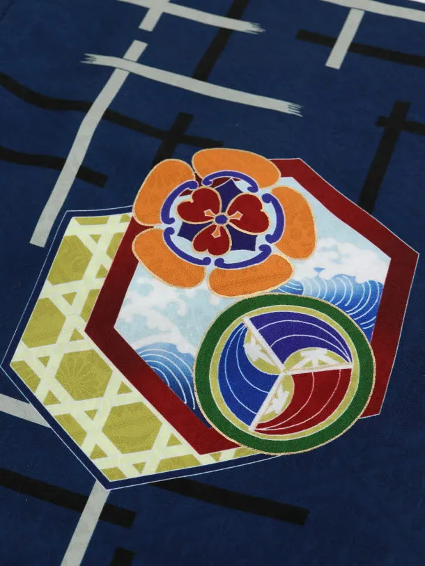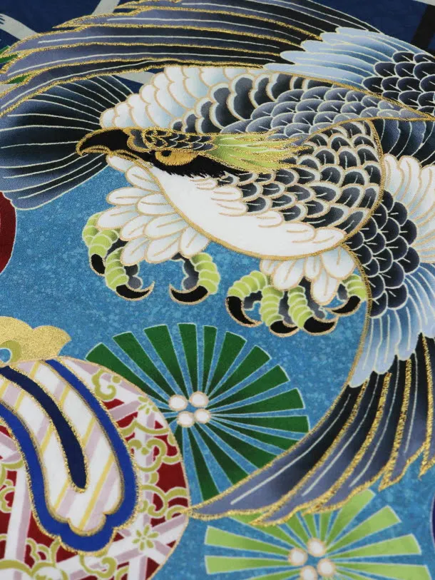 紺地に、鷹と宝尽くし柄が描かれたお着物です。鮮やかな色使いで描かれた凛々しい鷹とおめでたい宝尽くし柄が華やかで豪華な雰囲気です。背景の格子柄がモダンな印象を添えます。
