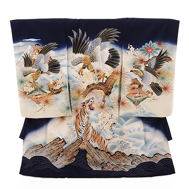 男児産着 お宮参り レンタル 正絹 1446 紺地 鷹 宝尽し