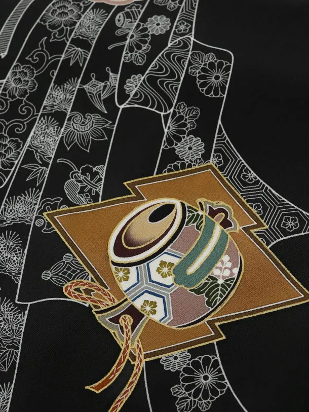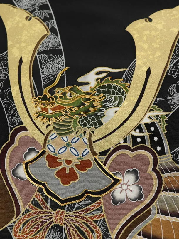 チャコールグレー地に、熨斗(のし)と兜が描かれたお着物です。中央の兜が凛々しく力強い雰囲気です。背景の熨斗(のし)は線で描かれていて、シンプルで洗練された印象を添えます。