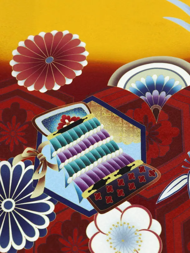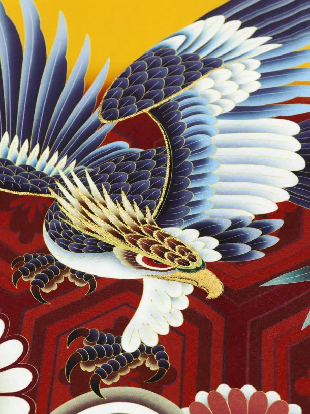 黄土色と真紅の地色に、鷹や花、兜が描かれたお着物です。個性的な色合いに、勇壮に舞う鷹と凛々しい兜が豪華な雰囲気です。周りに描かれた花が華やかさをより一層引き立てます。