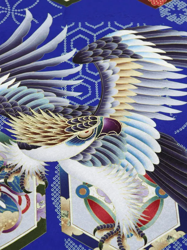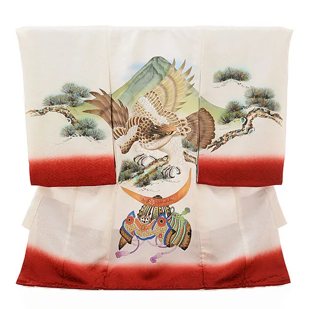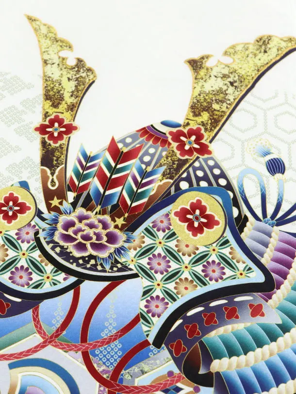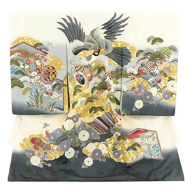 白と群青色の地色に、兜と鷹が描かれたお着物です。凛々しい兜と勇壮に舞う鷹が華やかな印象です。鮮やかな群青色のグラデーションが美しい一枚です。正統派な装いとして、神社へのお宮参りや記念撮影におすすめです。