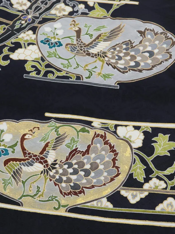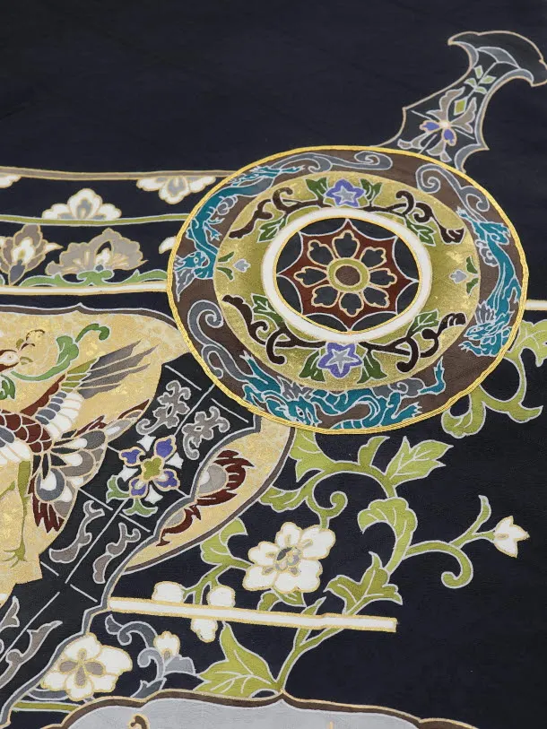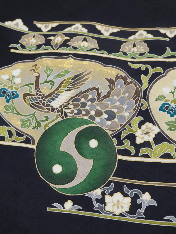 黒地に、三種の神器が描かれたお着物です。古くから日本に代々伝えた宝物、八咫鏡、草薙剣、八尺瓊勾玉をあしらった珍しい初着です。シックな色使いながら、豪華で華やかな印象です。