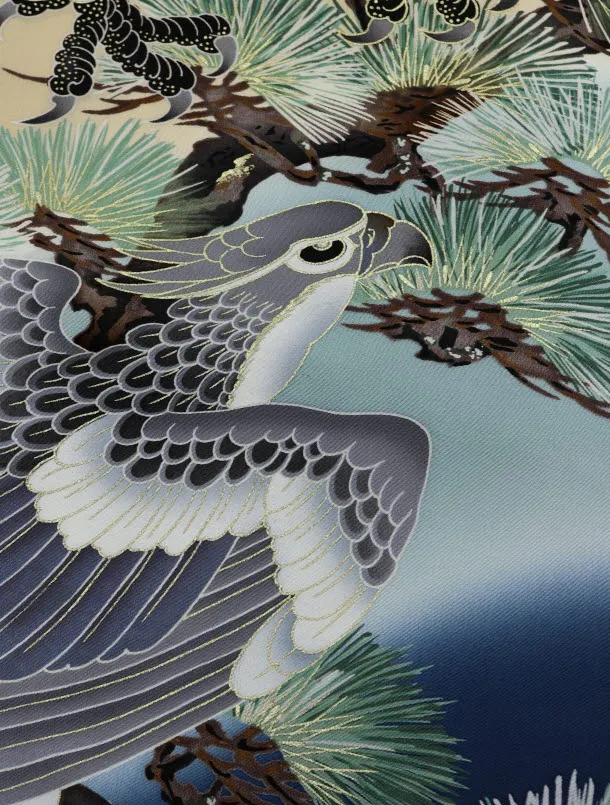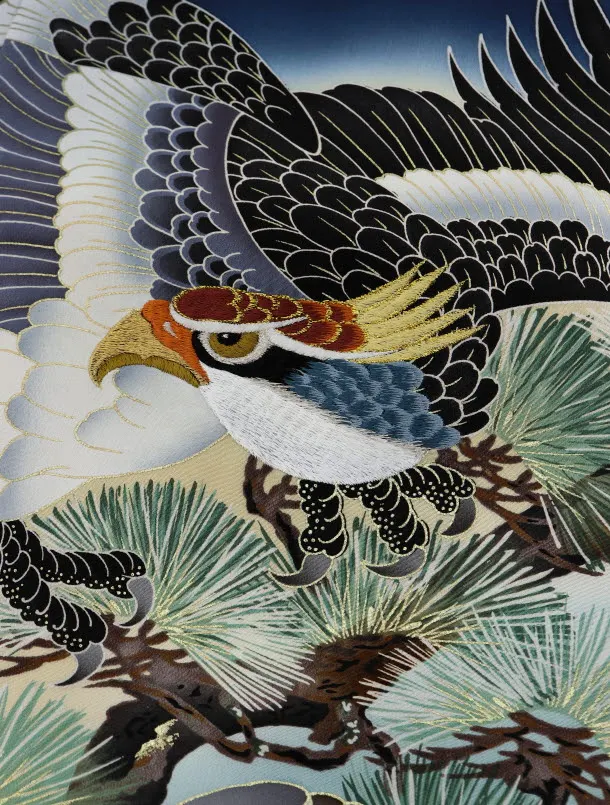 紺地に勇ましい鷹の刺繍とおめでたい松の柄のお祝い着です。神社へのお宮参りの晴れ着や記念撮影にオススメです。
