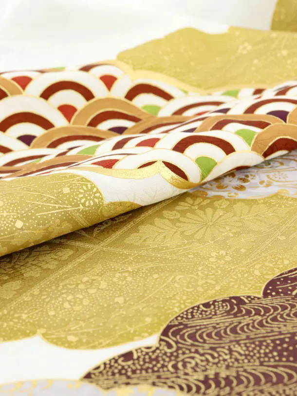 お祝い着をかける時は 絵柄がよく見える様に広げ抱いた子供の体を覆う様に掛け産着の付紐の一方を肩側から他方を脇から通して 抱き手の方の背で蝶結びにします。