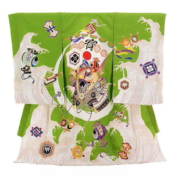 お祝い着をかける時は 絵柄がよく見える様に広げ抱いた子供の体を覆う様に掛け産着の付紐の一方を肩側から他方を脇から通して 抱き手の方の背で蝶結びにします。