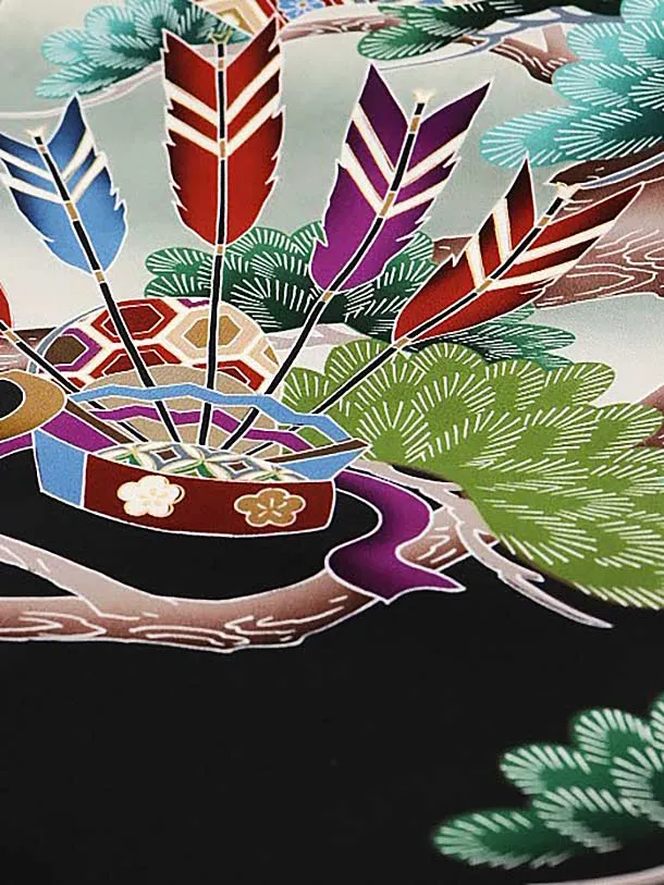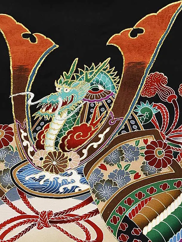 男児産着 お宮参りレンタル1641 【正絹】黒地 松に刺繍 兜