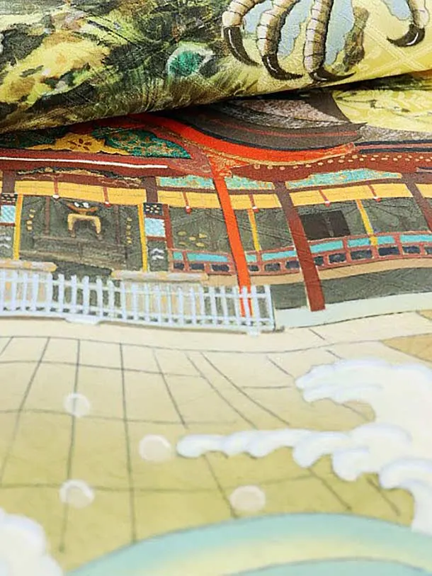 お祝い着をかける時は 絵柄がよく見える様に広げ抱いた子供の体を覆う様に掛け産着の付紐の一方を肩側から他方を脇から通して 抱き手の方の背で蝶結びにします。