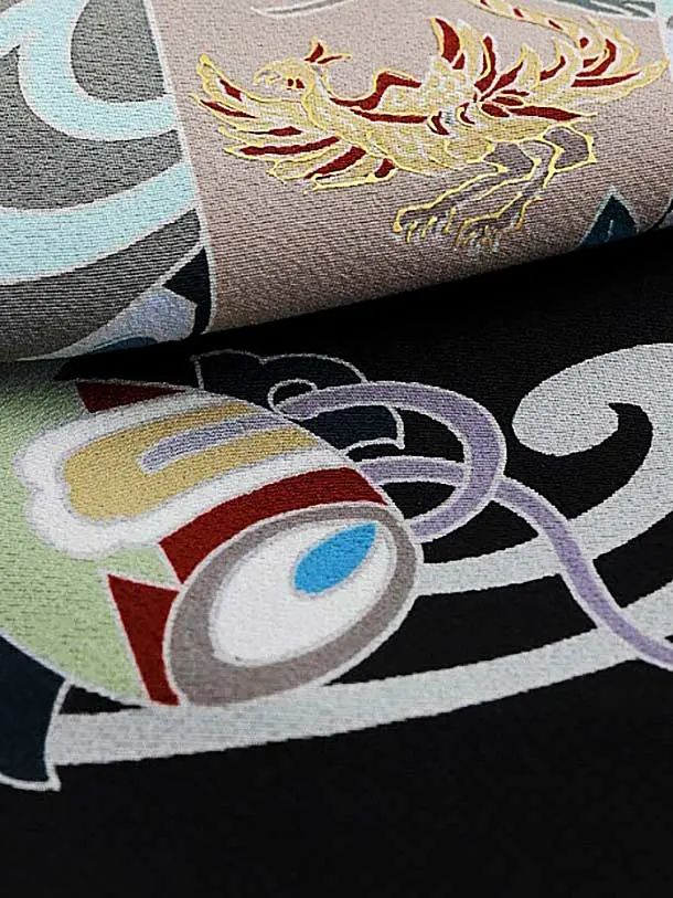 お祝い着をかける時は 絵柄がよく見える様に広げ抱いた子供の体を覆う様に掛け産着の付紐の一方を肩側から他方を脇から通して 抱き手の方の背で蝶結びにします。