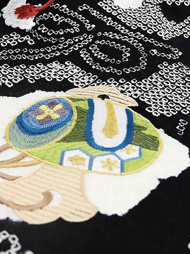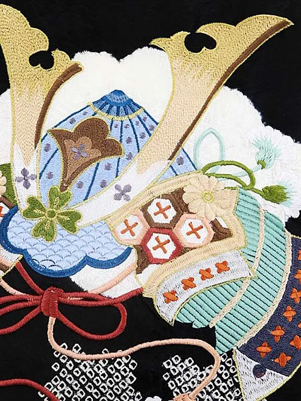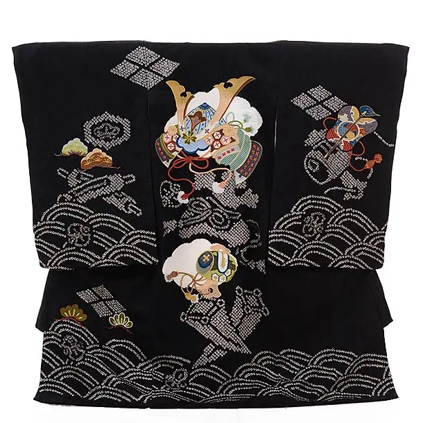 男児産着 お宮参りレンタル1668 【正絹】黒地 絞り 刺繍 兜 小槌