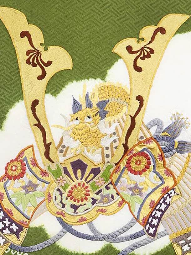 男児産着 お宮参りレンタル1673 【高級正絹】抹茶色 雲取り刺繍に兜