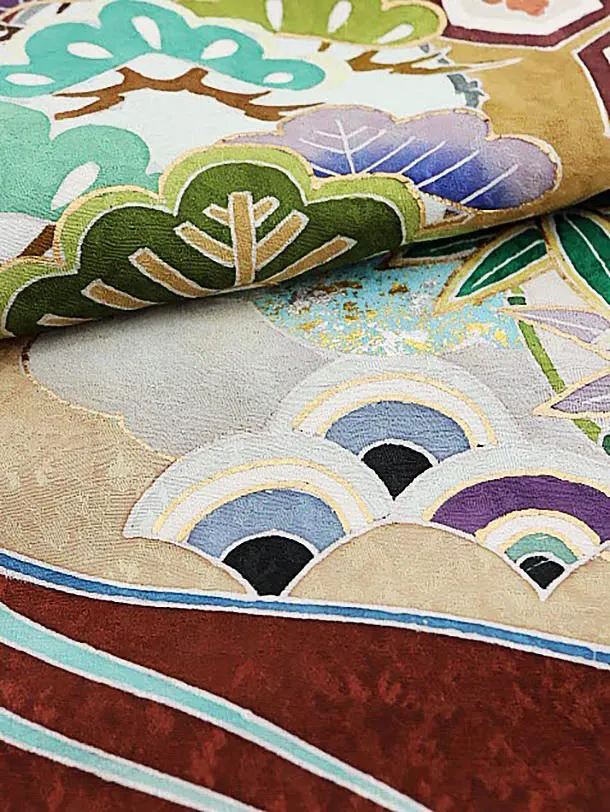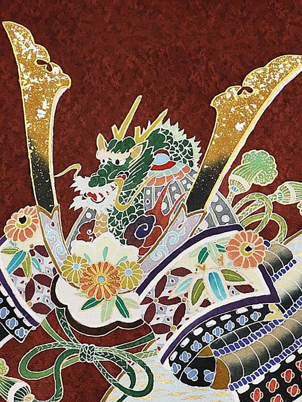 男児産着 お宮参りレンタル1750【高級正絹】茶色地 扇絵に兜