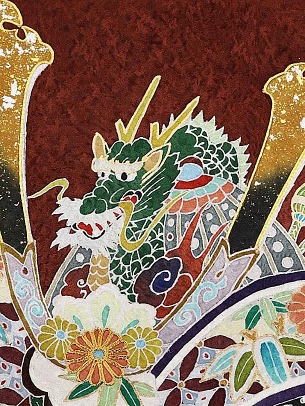 お祝い着をかける時は 絵柄がよく見える様に広げ抱いた子供の体を覆う様に掛け産着の付紐の一方を肩側から他方を脇から通して 抱き手の方の背で蝶結びにします。