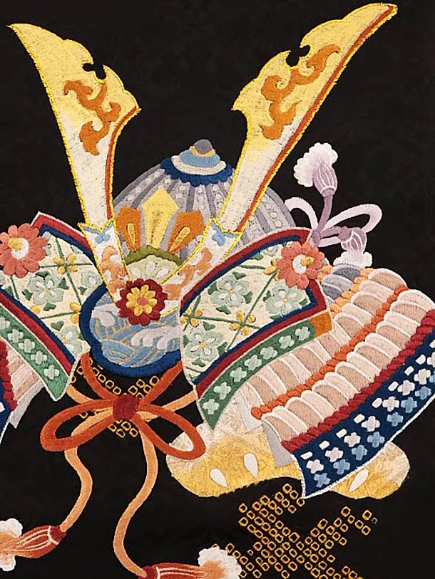 男児産着 お宮参りレンタル1856 黒地 刺繍 兜 扇