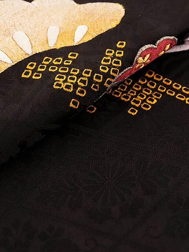 お祝い着をかける時は 絵柄がよく見える様に広げ抱いた子供の体を覆う様に掛け産着の付紐の一方を肩側から他方を脇から通して 抱き手の方の背で蝶結びにします。