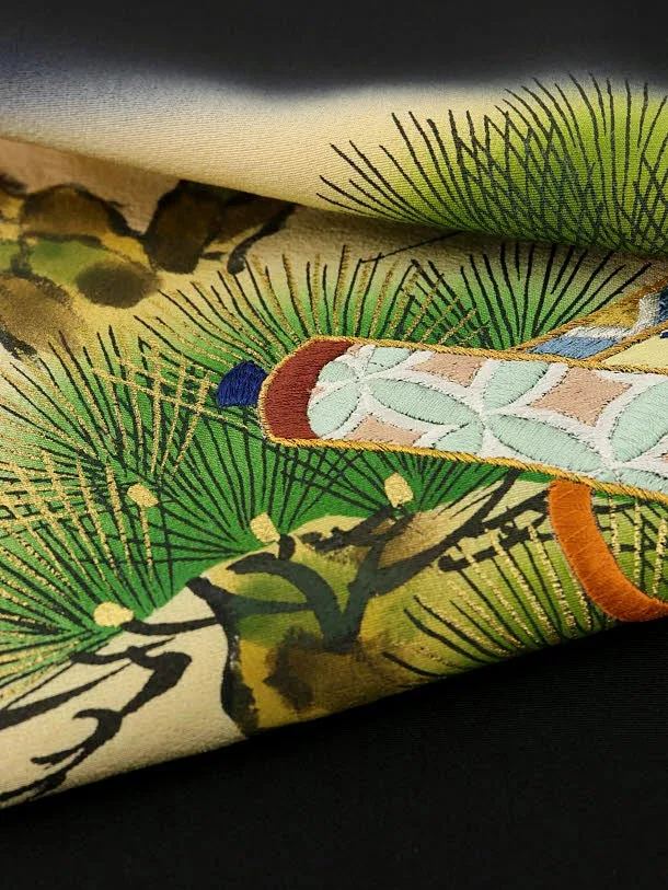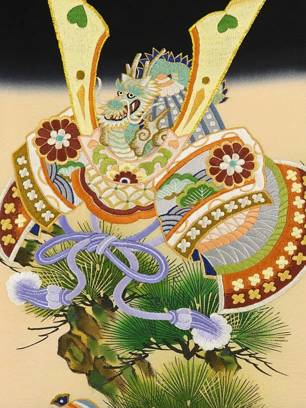 男児産着 お宮参りレンタル1915 正絹 黒地 刺繍 兜と松