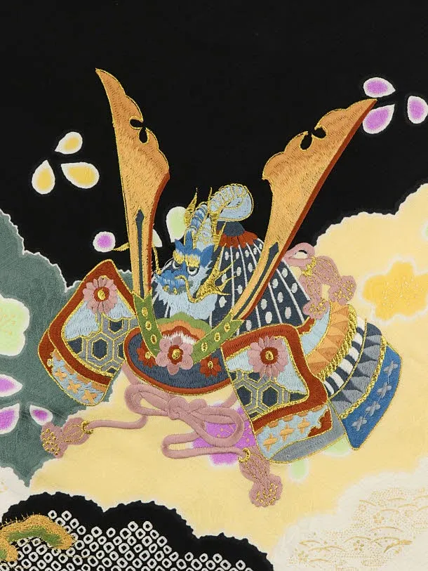男児産着 お宮参りレンタル1919 正絹 黒地 雲取り刺繍 兜