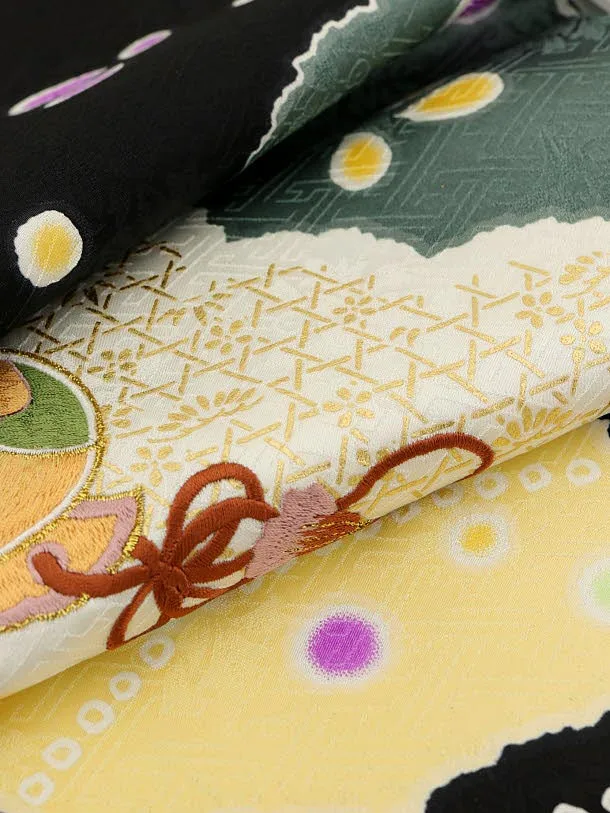 お祝い着をかける時は 絵柄がよく見える様に広げ抱いた子供の体を覆う様に掛け産着の付紐の一方を肩側から他方を脇から通して 抱き手の方の背で蝶結びにします。