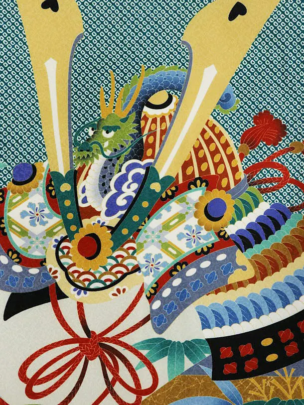 男児産着 お宮参りレンタル1940 グリーン疋田柄 兜に竹