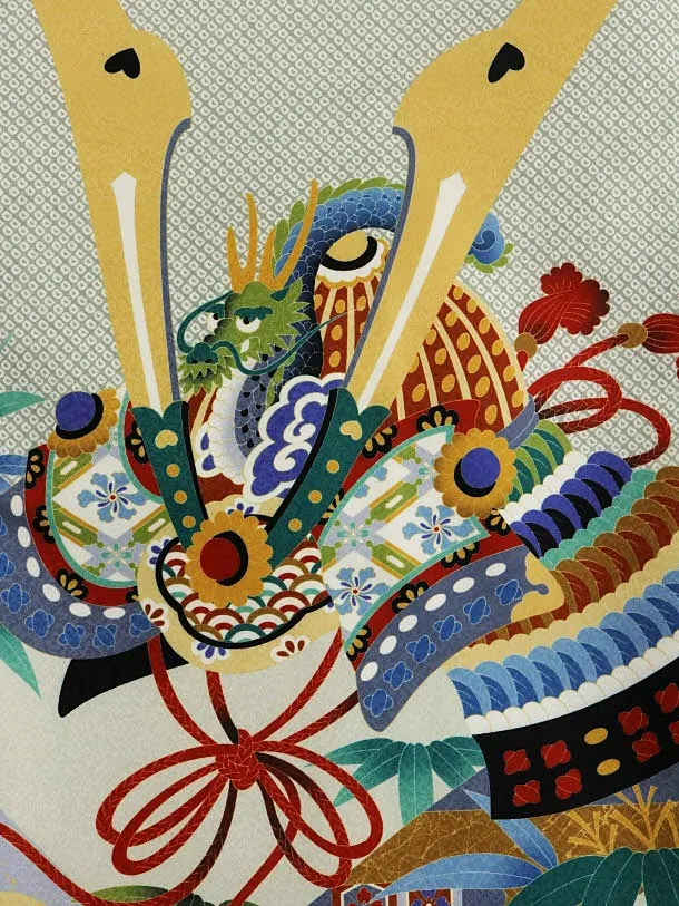 お祝い着をかける時は 絵柄がよく見える様に広げ抱いた子供の体を覆う様に掛け産着の付紐の一方を肩側から他方を脇から通して 抱き手の方の背で蝶結びにします。