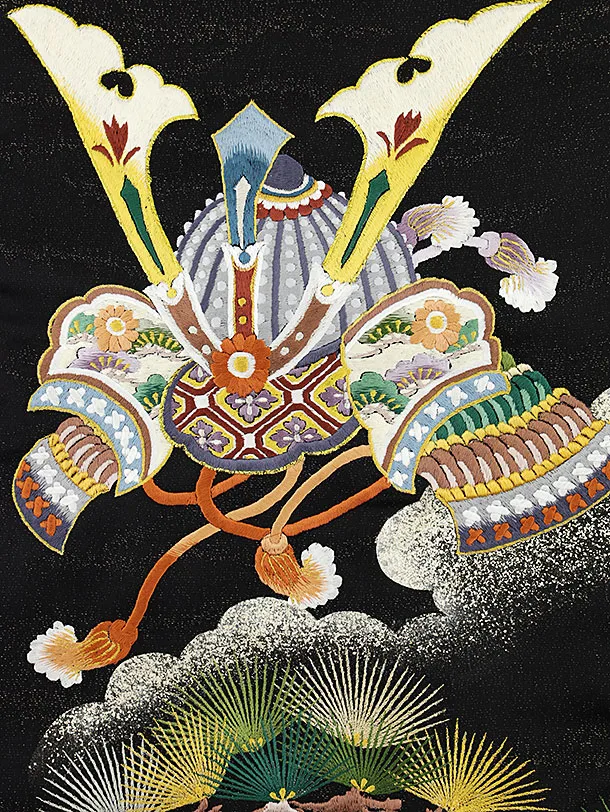 男児産着 お宮参りレンタル2014【高級正絹】 黒地ラメ 兜 鷹