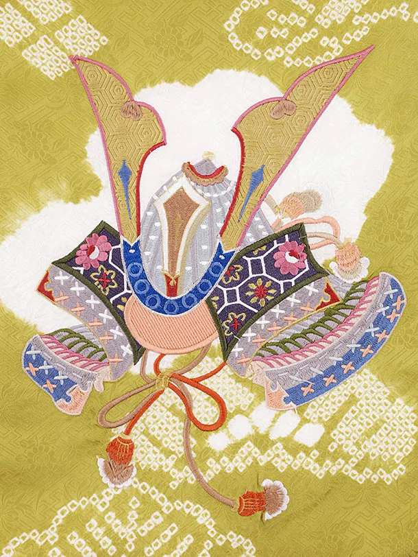 男児産着 お宮参りレンタル2019 正絹 からし色地 兜