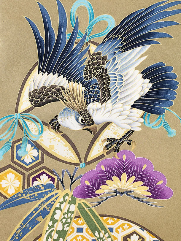 お祝い着をかける時は 絵柄がよく見える様に広げ抱いた子供の体を覆う様に掛け産着の付紐の一方を肩側から他方を脇から通して 抱き手の方の背で蝶結びにします。