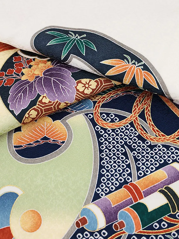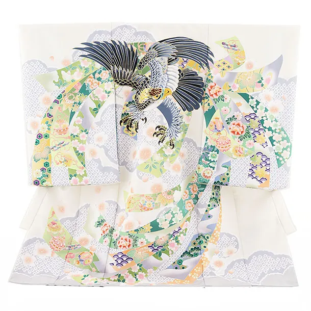 お祝い着をかける時は 絵柄がよく見える様に広げ抱いた子供の体を覆う様に掛け産着の付紐の一方を肩側から他方を脇から通して 抱き手の方の背で蝶結びにします。