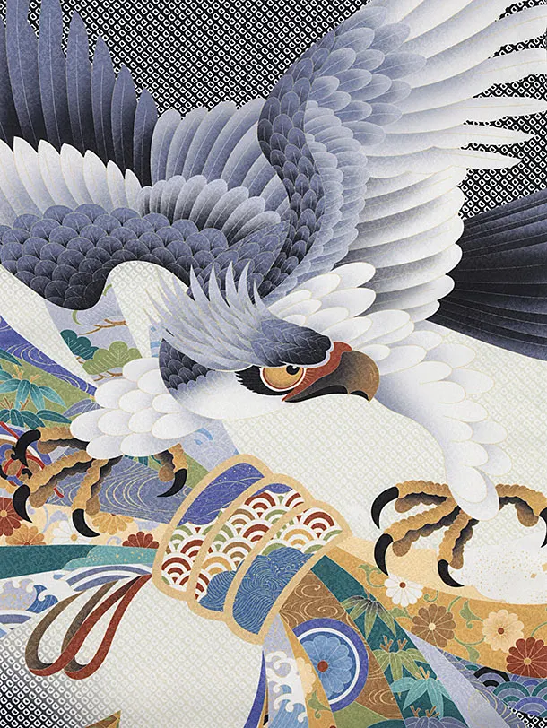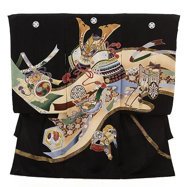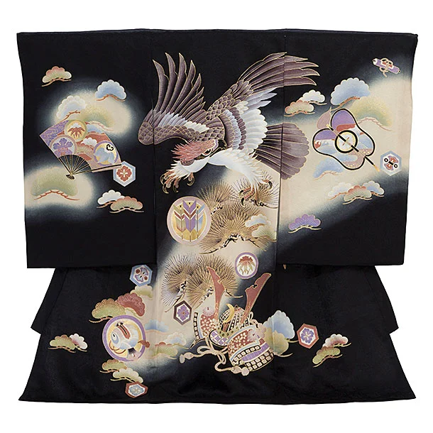 男児産着 お宮参りレンタル2209 黒地 疋田柄 鷹に熨斗