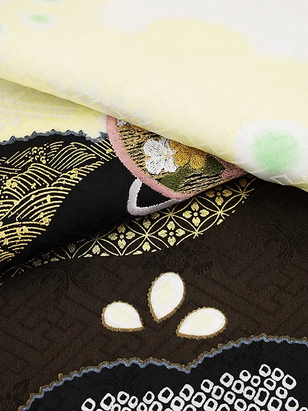 お祝い着をかける時は 絵柄がよく見える様に広げ抱いた子供の体を覆う様に掛け産着の付紐の一方を肩側から他方を脇から通して 抱き手の方の背で蝶結びにします。