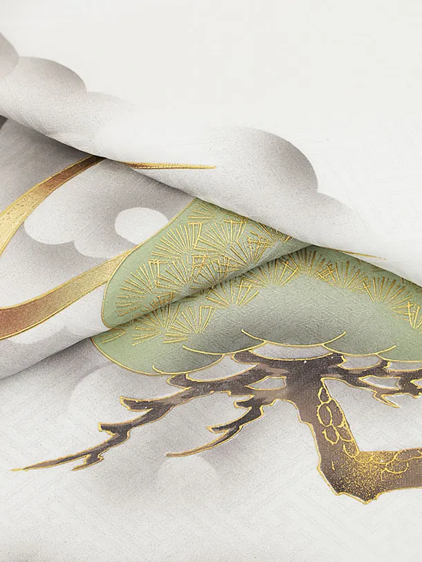 お祝い着をかける時は 絵柄がよく見える様に広げ抱いた子供の体を覆う様に掛け産着の付紐の一方を肩側から他方を脇から通して 抱き手の方の背で蝶結びにします。