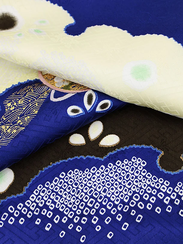 お祝い着をかける時は 絵柄がよく見える様に広げ抱いた子供の体を覆う様に掛け産着の付紐の一方を肩側から他方を脇から通して 抱き手の方の背で蝶結びにします。