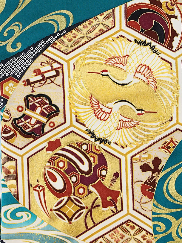 男児産着 お宮参りレンタル2313 伝産ターコイズ地 亀甲文に宝尽くし