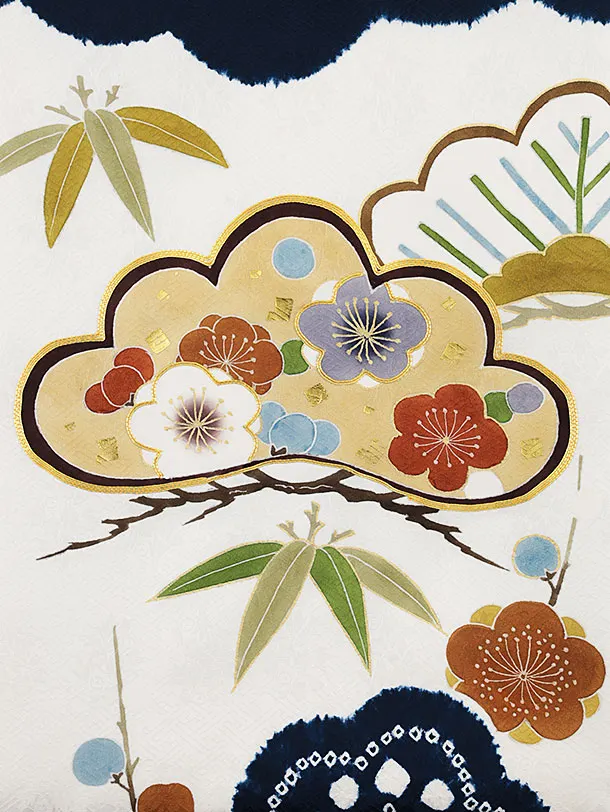お祝い着をかける時は 絵柄がよく見える様に広げ抱いた子供の体を覆う様に掛け産着の付紐の一方を肩側から他方を脇から通して 抱き手の方の背で蝶結びにします。