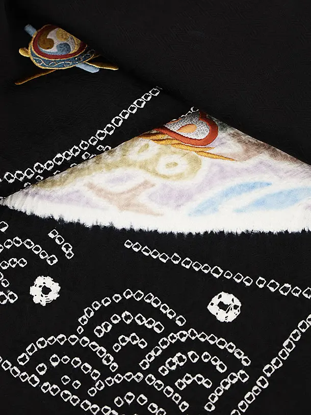 お祝い着をかける時は 絵柄がよく見える様に広げ抱いた子供の体を覆う様に掛け産着の付紐の一方を肩側から他方を脇から通して 抱き手の方の背で蝶結びにします。