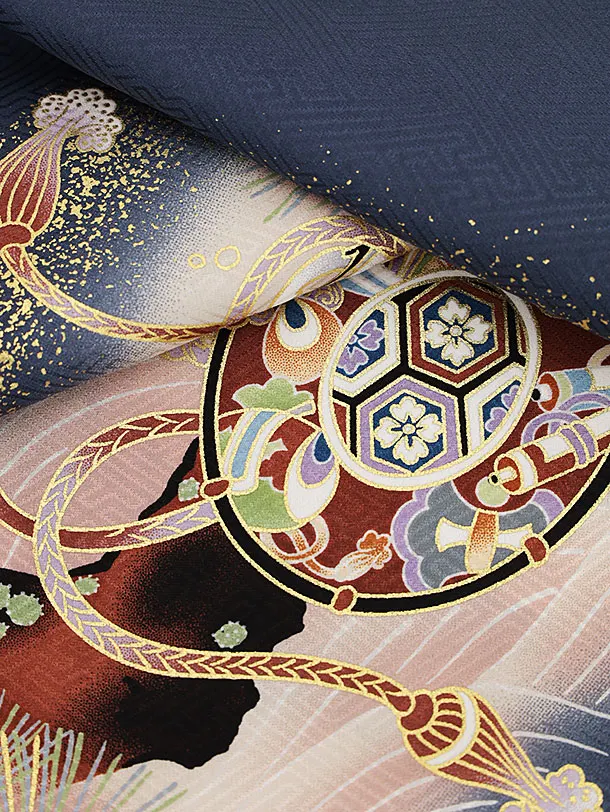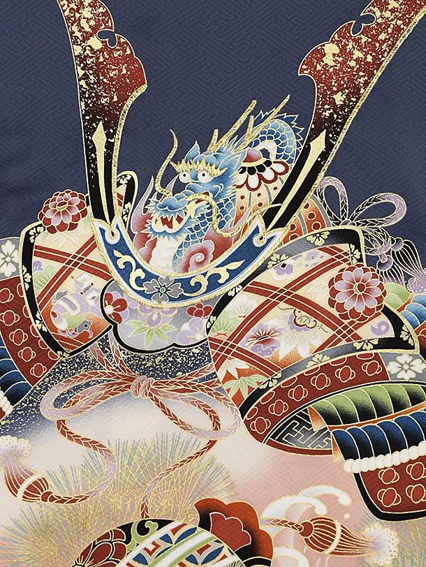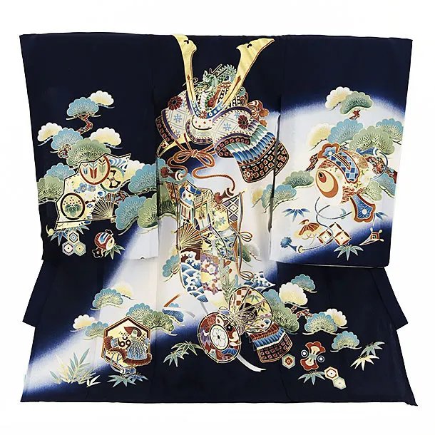 夏用 男児産着 お宮参り 2464 単衣 ブルーグレー地 兜 小槌