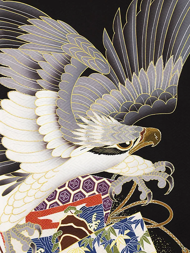男児産着 お宮参りレンタル2504 正絹 黒地 鷹に色紙