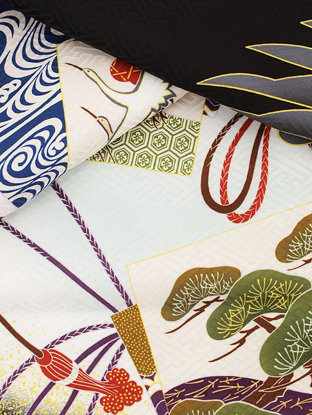 お祝い着をかける時は 絵柄がよく見える様に広げ抱いた子供の体を覆う様に掛け産着の付紐の一方を肩側から他方を脇から通して 抱き手の方の背で蝶結びにします。