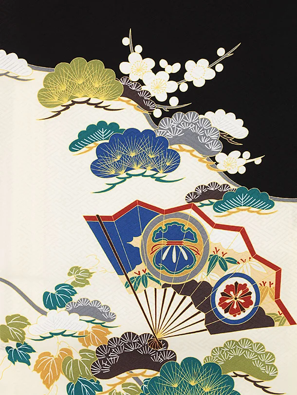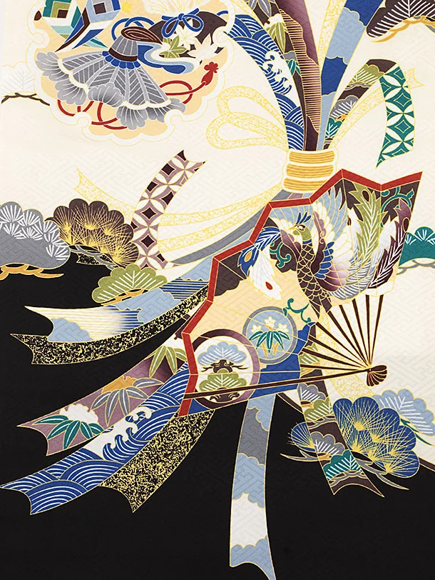 お祝い着をかける時は 絵柄がよく見える様に広げ抱いた子供の体を覆う様に掛け産着の付紐の一方を肩側から他方を脇から通して 抱き手の方の背で蝶結びにします。