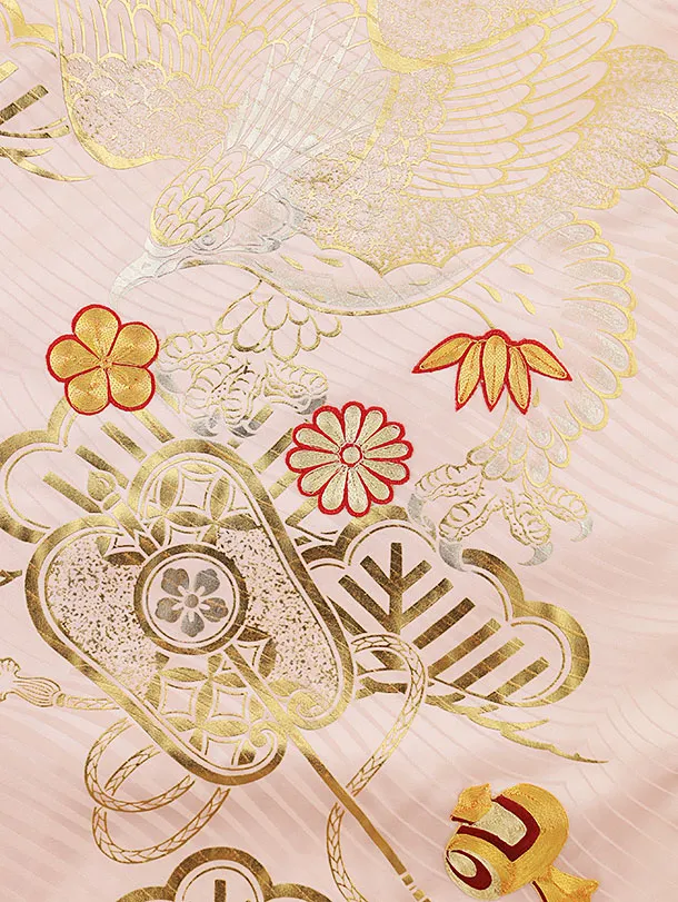 お祝い着をかける時は 絵柄がよく見える様に広げ抱いた子供の体を覆う様に掛け産着の付紐の一方を肩側から他方を脇から通して 抱き手の方の背で蝶結びにします。