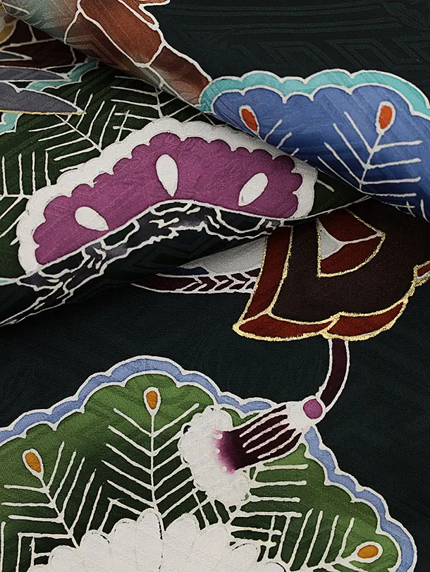 お祝い着をかける時は 絵柄がよく見える様に広げ抱いた子供の体を覆う様に掛け産着の付紐の一方を肩側から他方を脇から通して 抱き手の方の背で蝶結びにします。