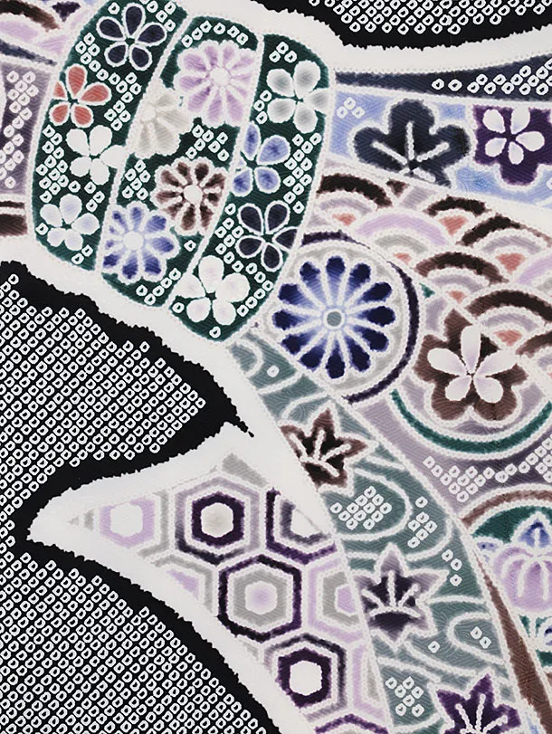 お祝い着をかける時は 絵柄がよく見える様に広げ抱いた子供の体を覆う様に掛け産着の付紐の一方を肩側から他方を脇から通して 抱き手の方の背で蝶結びにします。