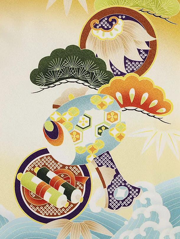 お祝い着をかける時は 絵柄がよく見える様に広げ抱いた子供の体を覆う様に掛け産着の付紐の一方を肩側から他方を脇から通して 抱き手の方の背で蝶結びにします。