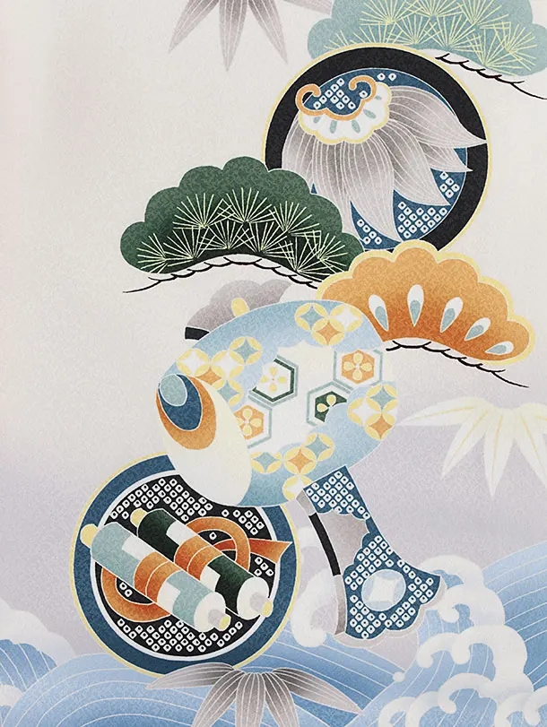 お祝い着をかける時は 絵柄がよく見える様に広げ抱いた子供の体を覆う様に掛け産着の付紐の一方を肩側から他方を脇から通して 抱き手の方の背で蝶結びにします。