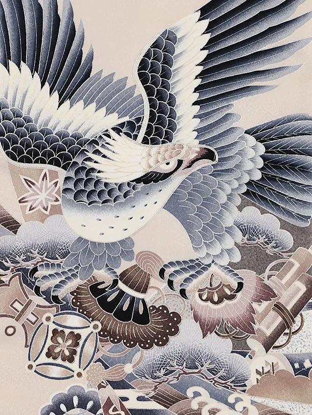 男児産着 お宮参りレンタル2574 ベージュ 鷹と兜に熨斗