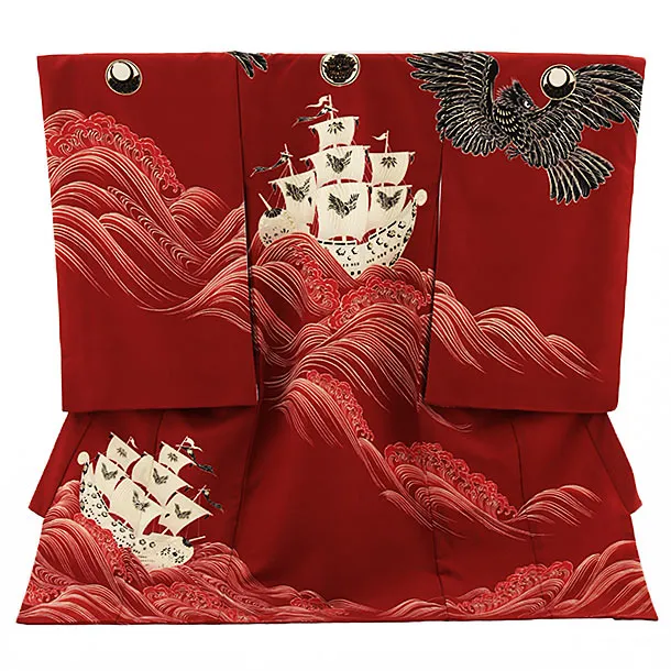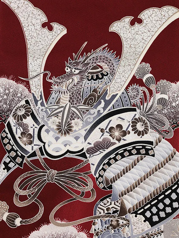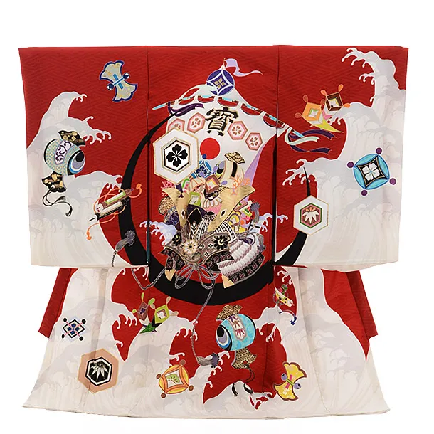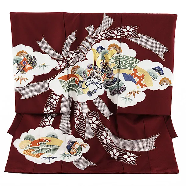 男児産着 お宮参りレンタル2579 ワイン色 兜に松