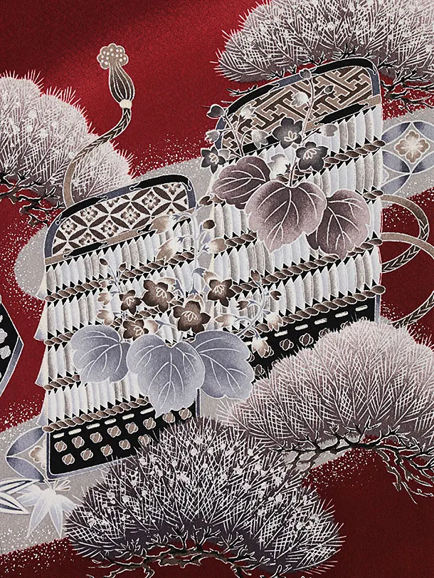 お祝い着をかける時は 絵柄がよく見える様に広げ抱いた子供の体を覆う様に掛け産着の付紐の一方を肩側から他方を脇から通して 抱き手の方の背で蝶結びにします。