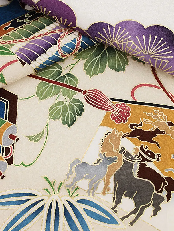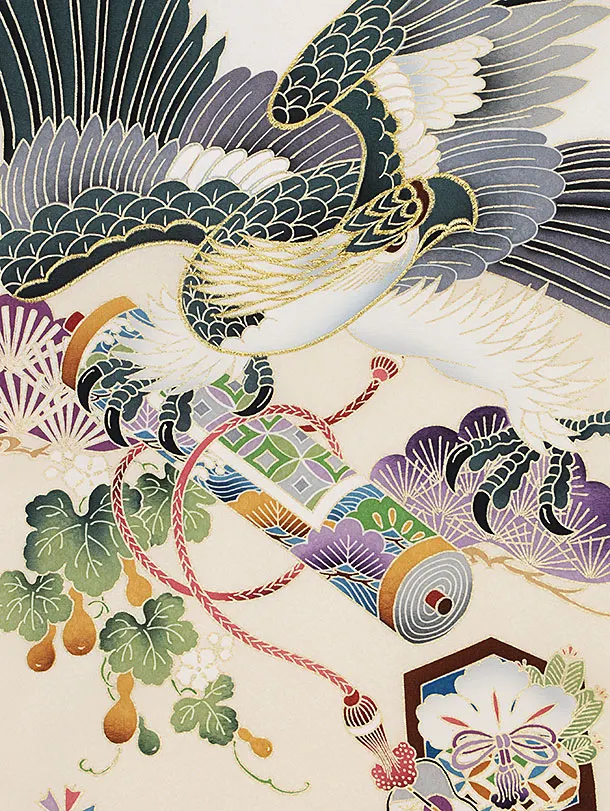 お祝い着をかける時は 絵柄がよく見える様に広げ抱いた子供の体を覆う様に掛け産着の付紐の一方を肩側から他方を脇から通して 抱き手の方の背で蝶結びにします。