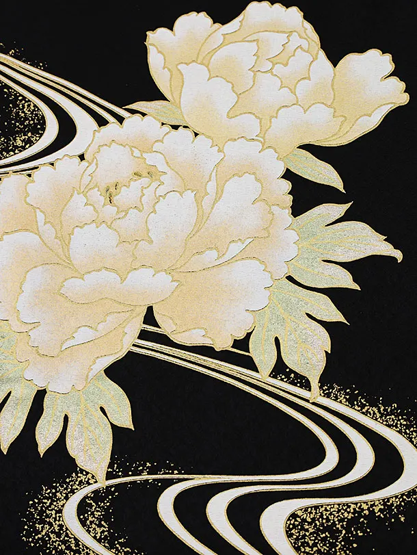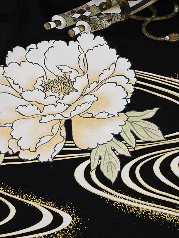 お祝い着をかける時は 絵柄がよく見える様に広げ抱いた子供の体を覆う様に掛け産着の付紐の一方を肩側から他方を脇から通して 抱き手の方の背で蝶結びにします。