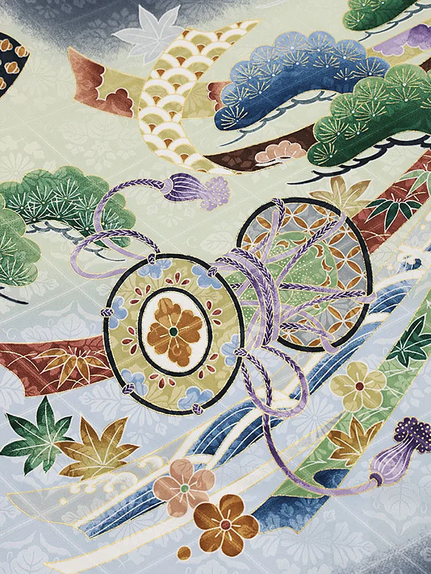 お祝い着をかける時は 絵柄がよく見える様に広げ抱いた子供の体を覆う様に掛け産着の付紐の一方を肩側から他方を脇から通して 抱き手の方の背で蝶結びにします。